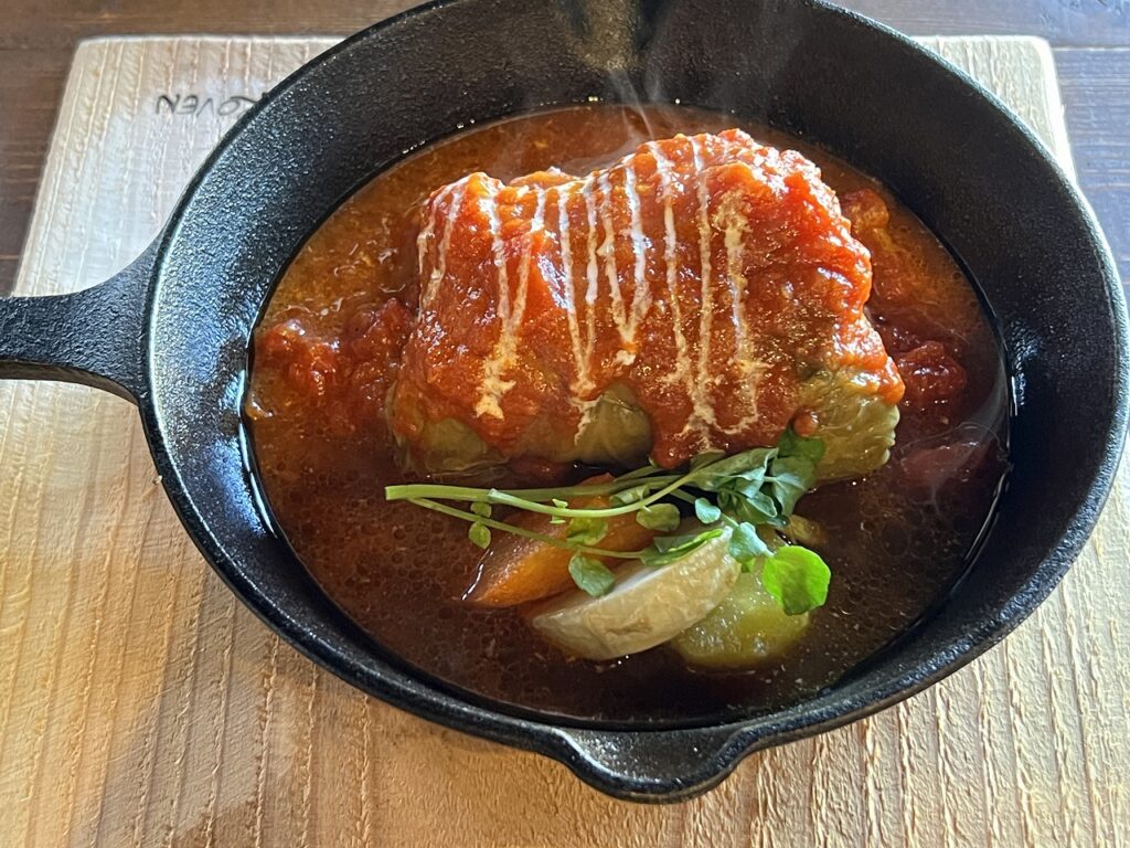 - 名物「デミグラスソースのロールキャベツ」。ナイフ不要の柔らかさと濃厚ソースが絶品。